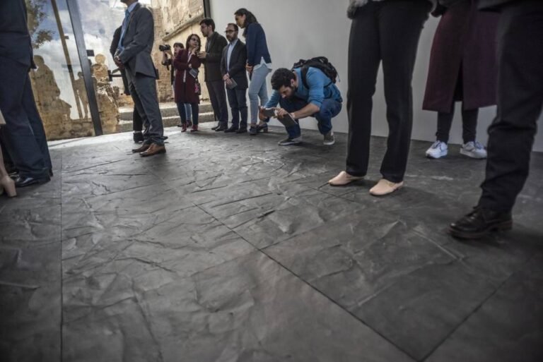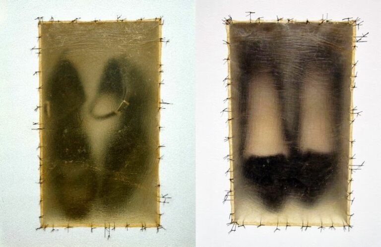 La obra “Fragmentos” representó, según la artista, un resultado neutral. Son unas láminas de metal que al pararse sobre ellas, reflejan que se pisan lo que alguna vez fueron elementos de guerra.