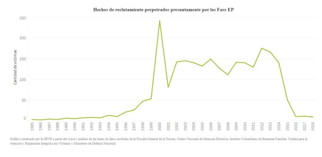 En este sentido son alrededor de 8.000 casos los que se trabajan, los cuales fueron reportados por la Fiscalía General de la Nación. Vale la pena mencionar que éstos tratan sobre la vinculación de niños y niñas a la guerra por parte de la antigua FARC-EP y la Fuerza Pública, tanto de quienes integraron sus filas para combate, pero también quienes lo hicieron para realizar otras tareas como cocineros, cargadores, mensajeros, informantes, acompañantes del grupo, y de quienes fueron reclutados para propósitos sexuales.