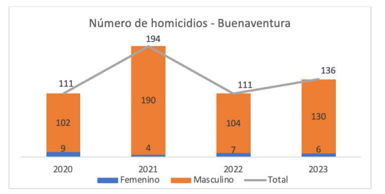 Según las cifras reportadas por la Policía Nacional, en el periodo 2020 – 2023, se registró el asesinato de 26 mujeres en Buenaventura, lo que corresponde al 4,7% del total de homicidios, que fue un de 552. Adicionalmente, según datos de la Secretaría de las Mujeres de los 26 casos alrededor de 8 han sido reconocidos y/o investigados como feminicidios.