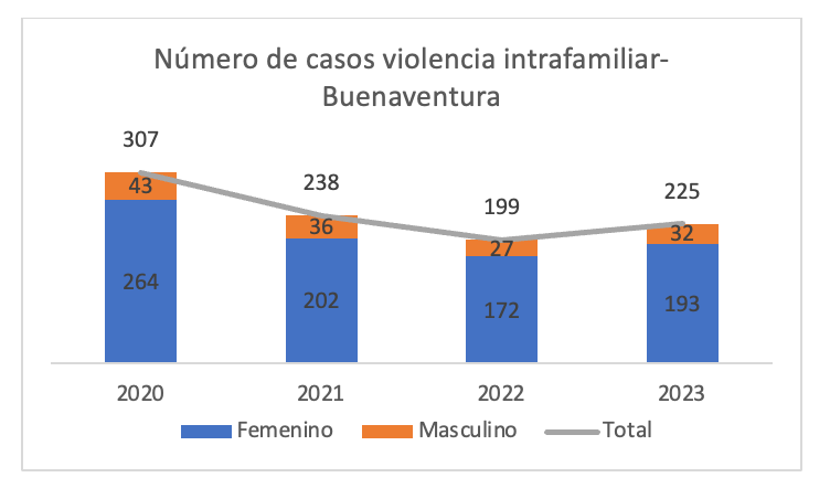 Para el número de casos reportados de violencia intrafamiliar en Buenaventura, sigue existiendo una afectación específica a las mujeres, las cuales representan más del 84% de las víctimas, destacando que el año 2020, que fue en el que más se presentaron casos, se atravesaban las restricciones de movilidad debido a la pandemia. Si bien los dos años siguientes se presentó una disminución significativa, para el año 2023 esta cifra volvió a presentar un incremento.