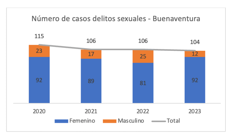 A diferencia de los reportes de violencia intrafamiliar, el número de casos de delitos sexuales, en los últimos años no presentan una disminución significativa en Buenaventura. No obstante, al igual que con la violencia intrafamiliar, las víctimas de los delitos sexuales son en su mayoría mujeres, que representan aproximadamente un 80% de las víctimas. Esta situación resalta la urgencia de abordar adecuadamente la violencia de género y la necesidad de implementar estrategias efectivas para prevenir y responder a estos delitos.